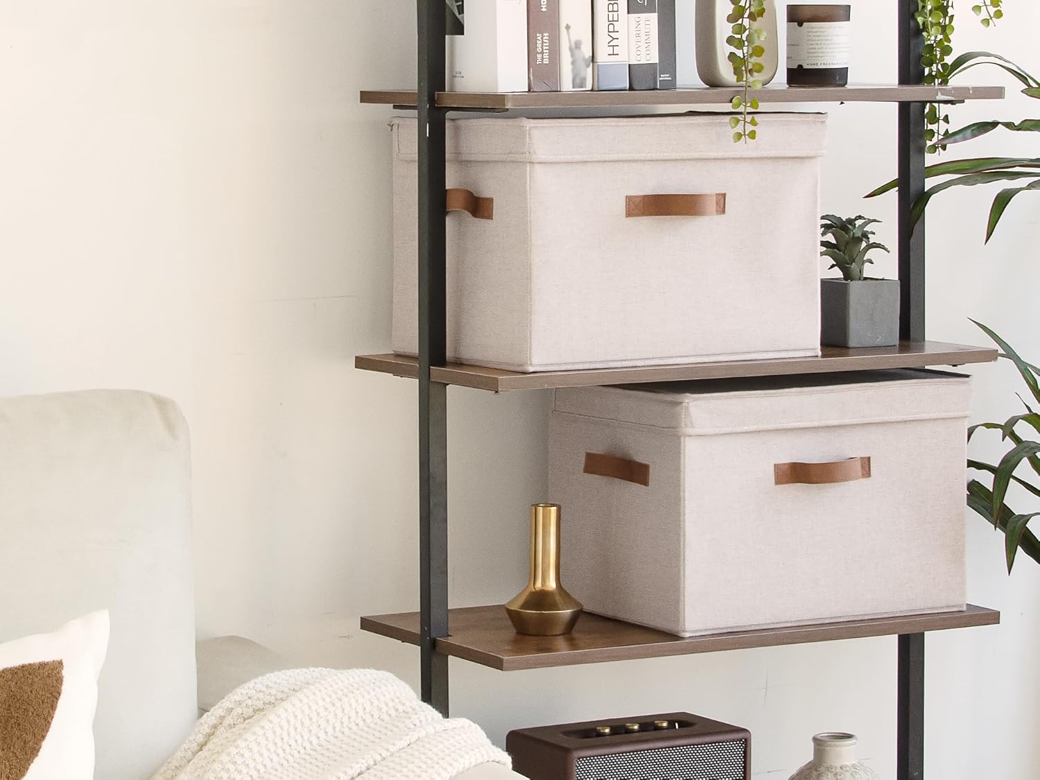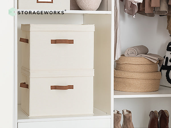 20L decorative baskets with lids for organization of towels, winter clothes, shoes, books, DVDs, office & crafts supplies, etc.; perfect to use as storage containers, makeup organizers, or medicine chests.