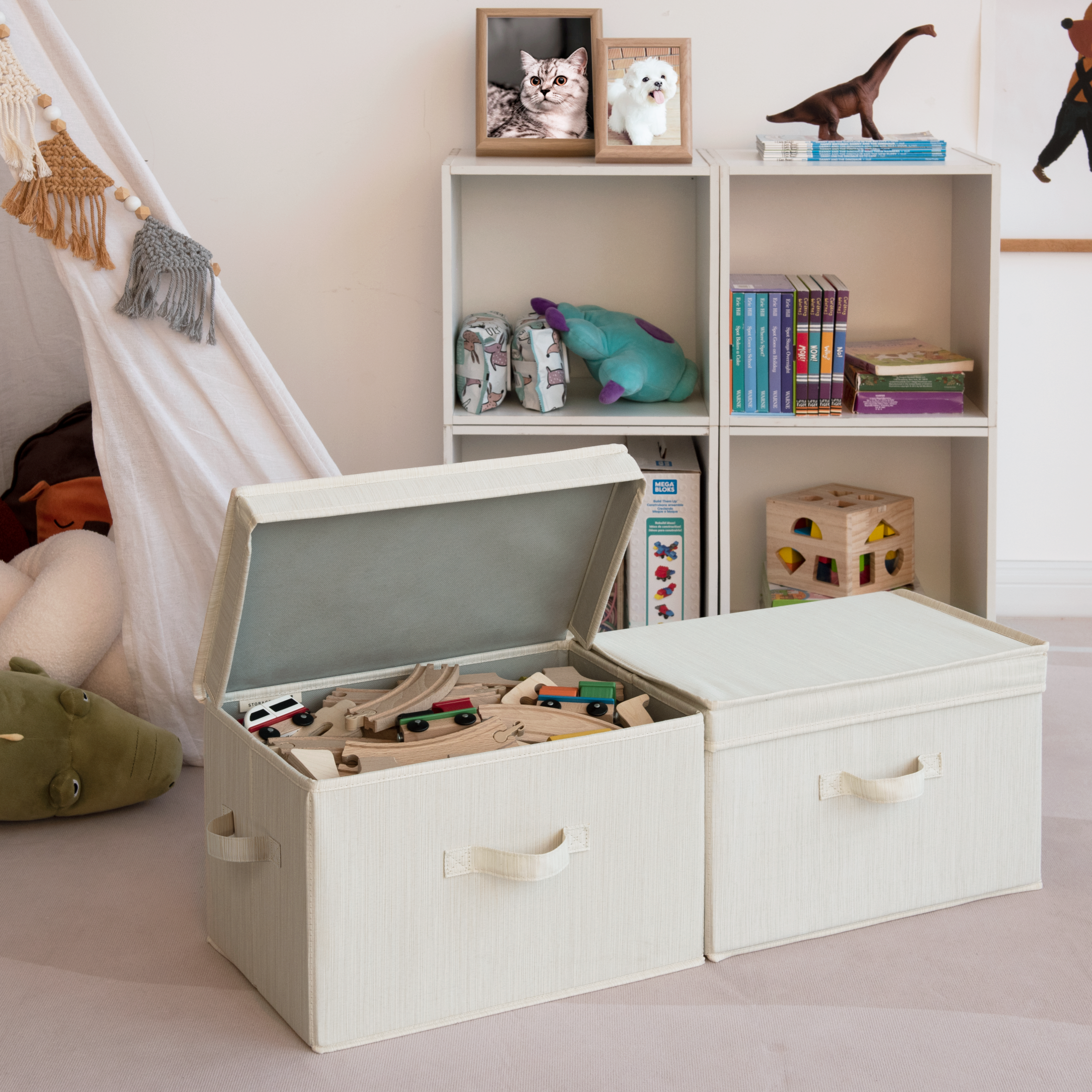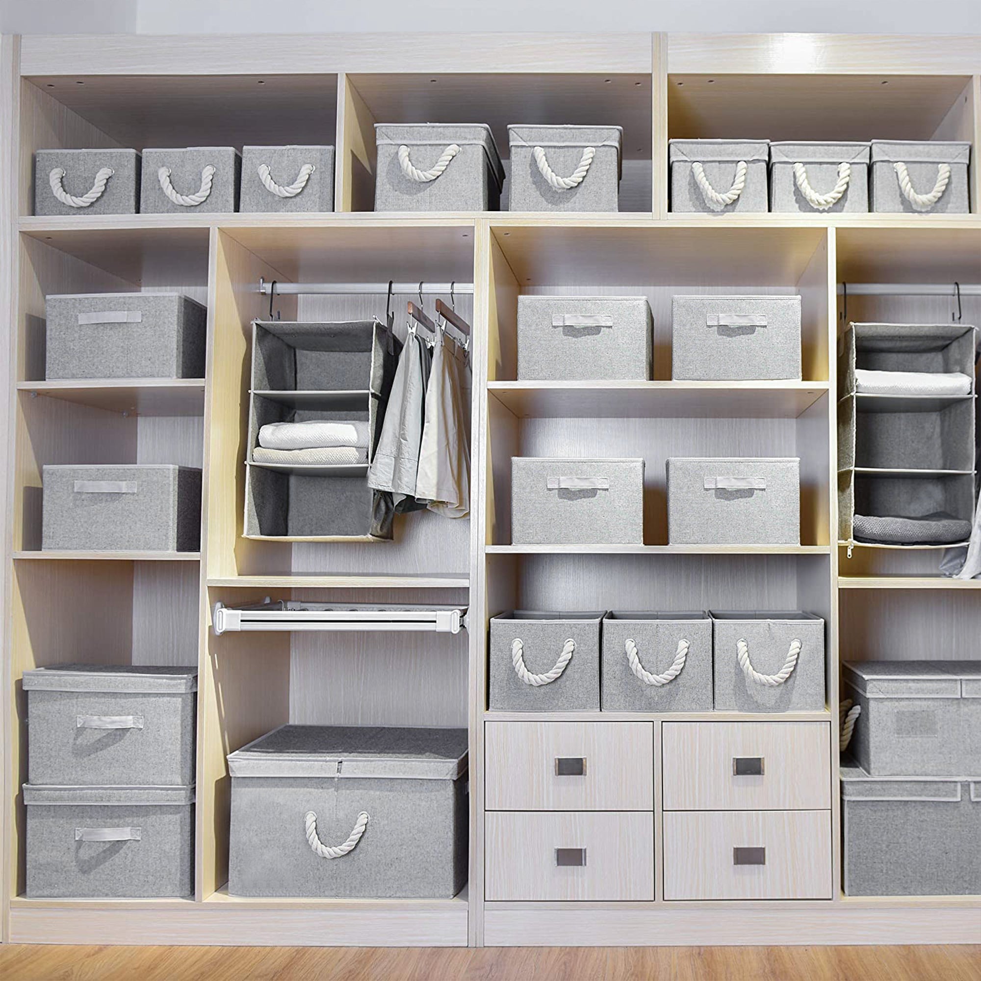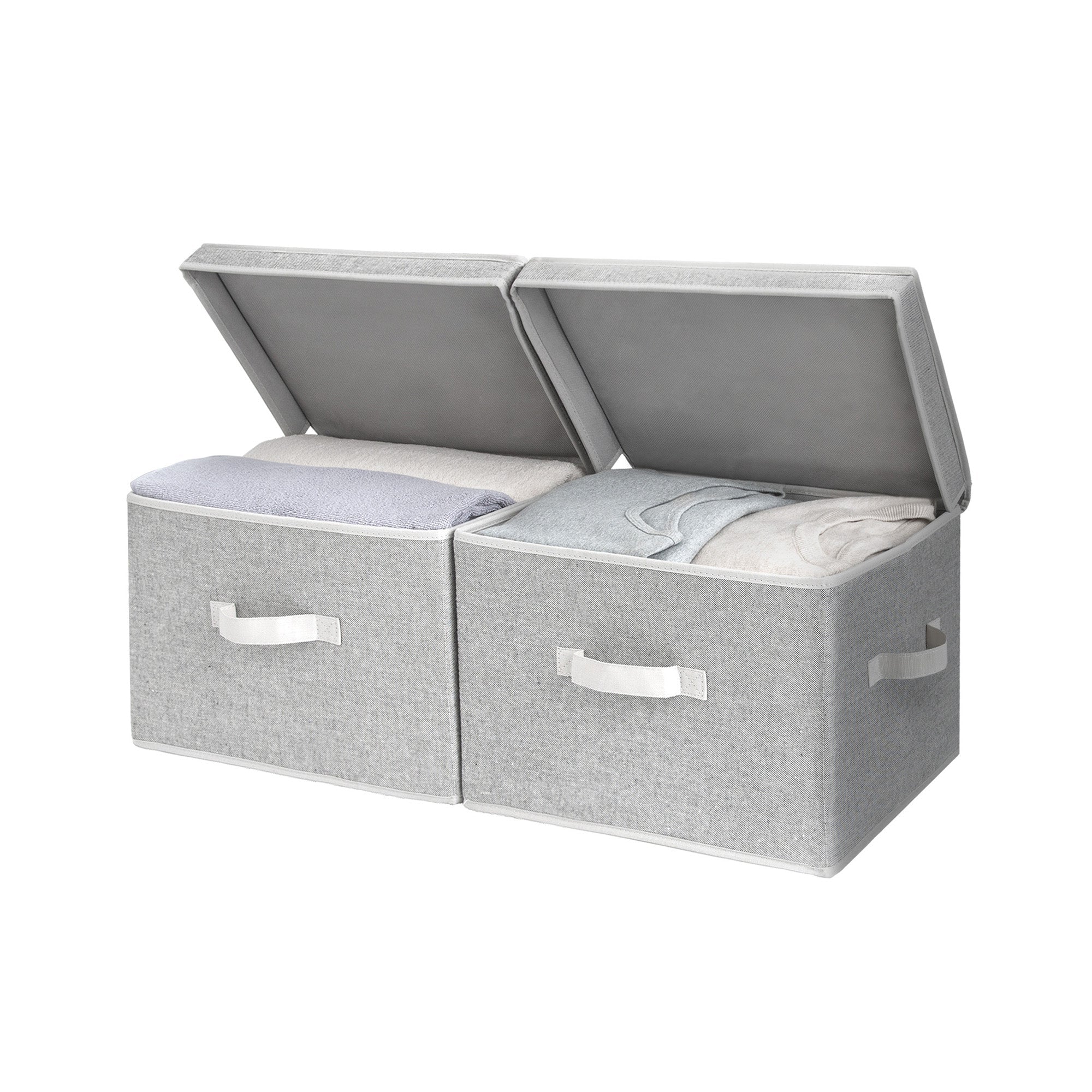 Dust-proof storage bins feature flip-top lids and 3 soft, sewn-in handles on the front and both sides.