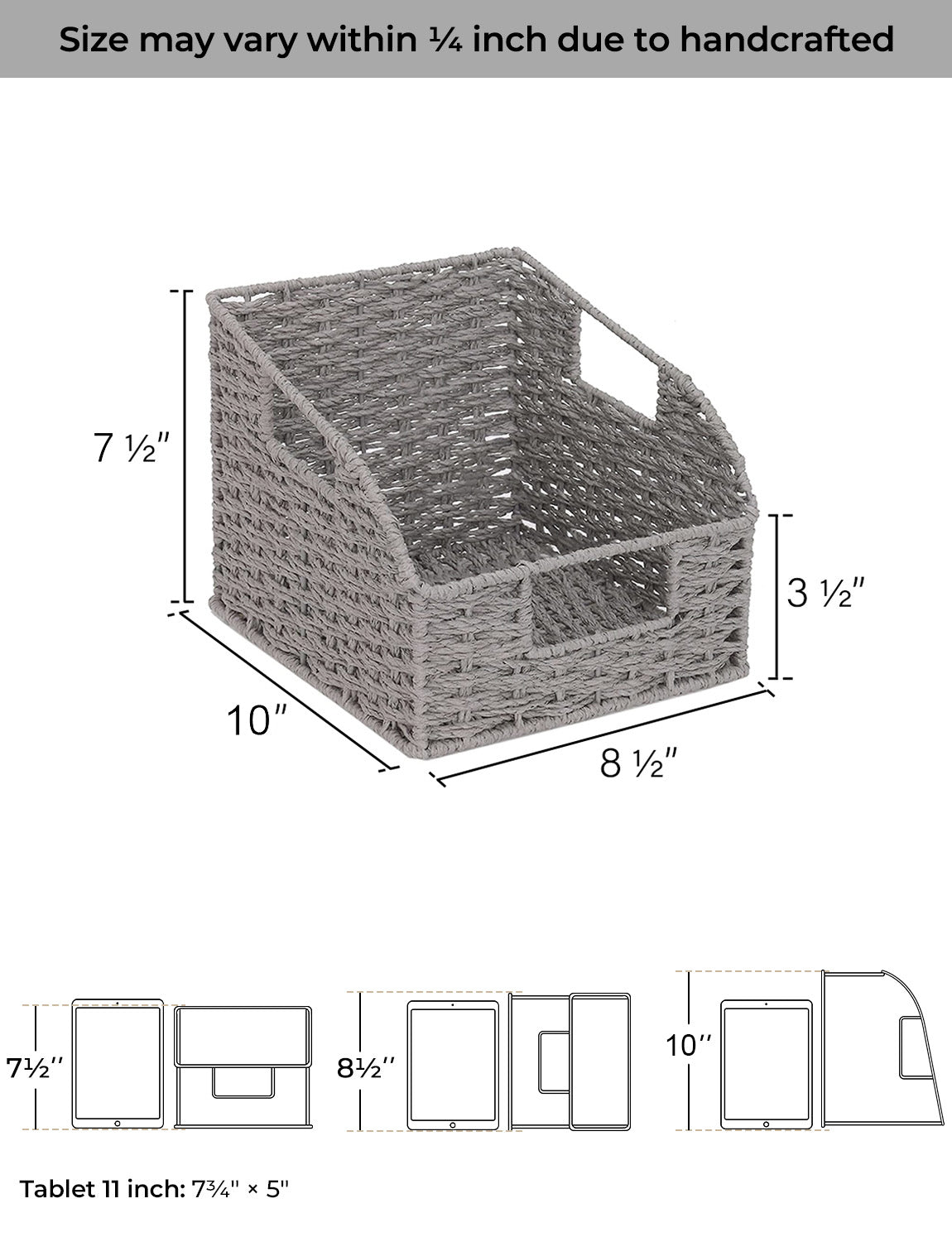 Dimensions: 8 ½"L x 10 ¼"W x 7 ½"H. Size may vary within 1/4 inch due to handwoven design.