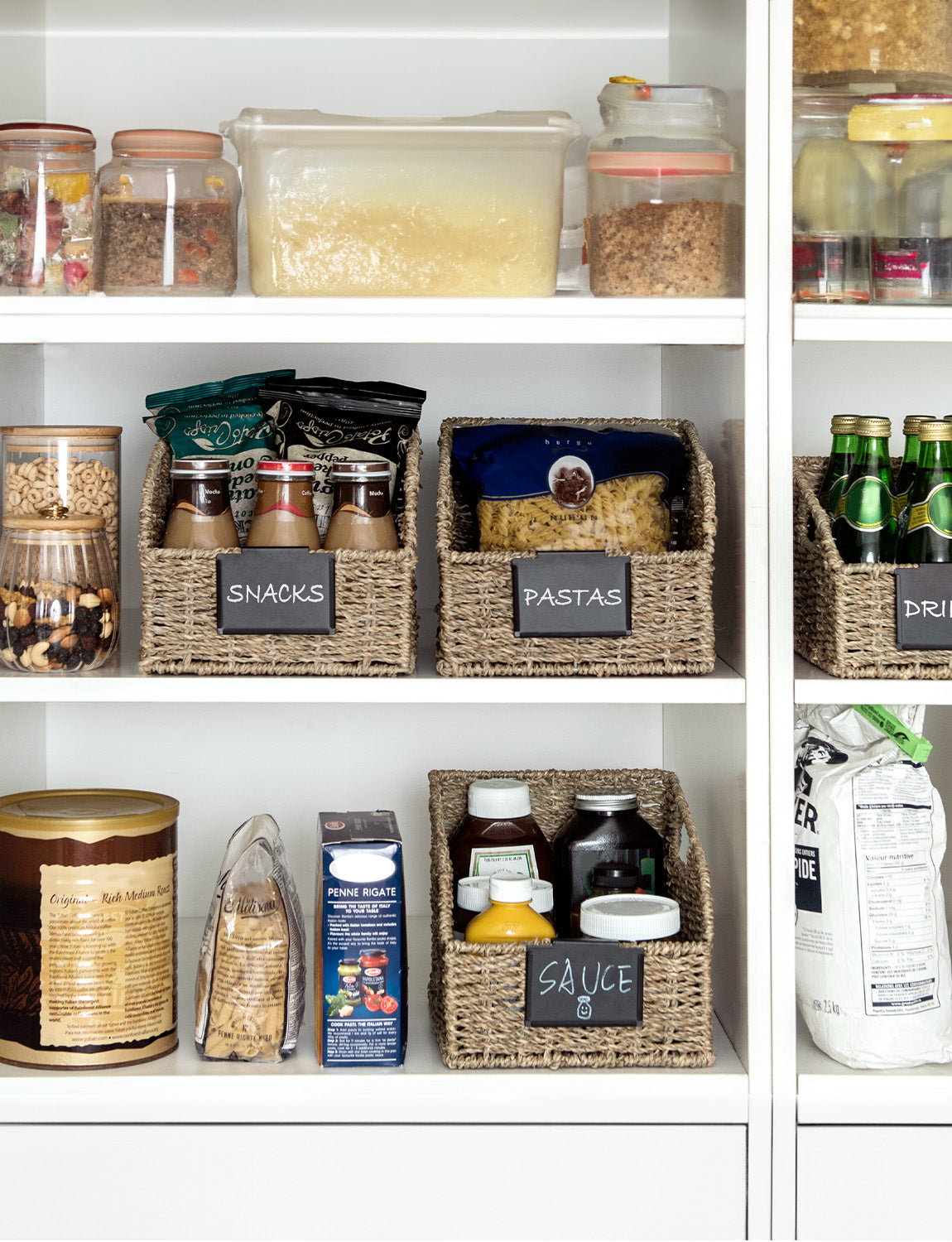 Versatile pantry baskets for spices, onions, canned foods, pet food in the kitchen, or magazines, iPads, Kindles, games, and media.