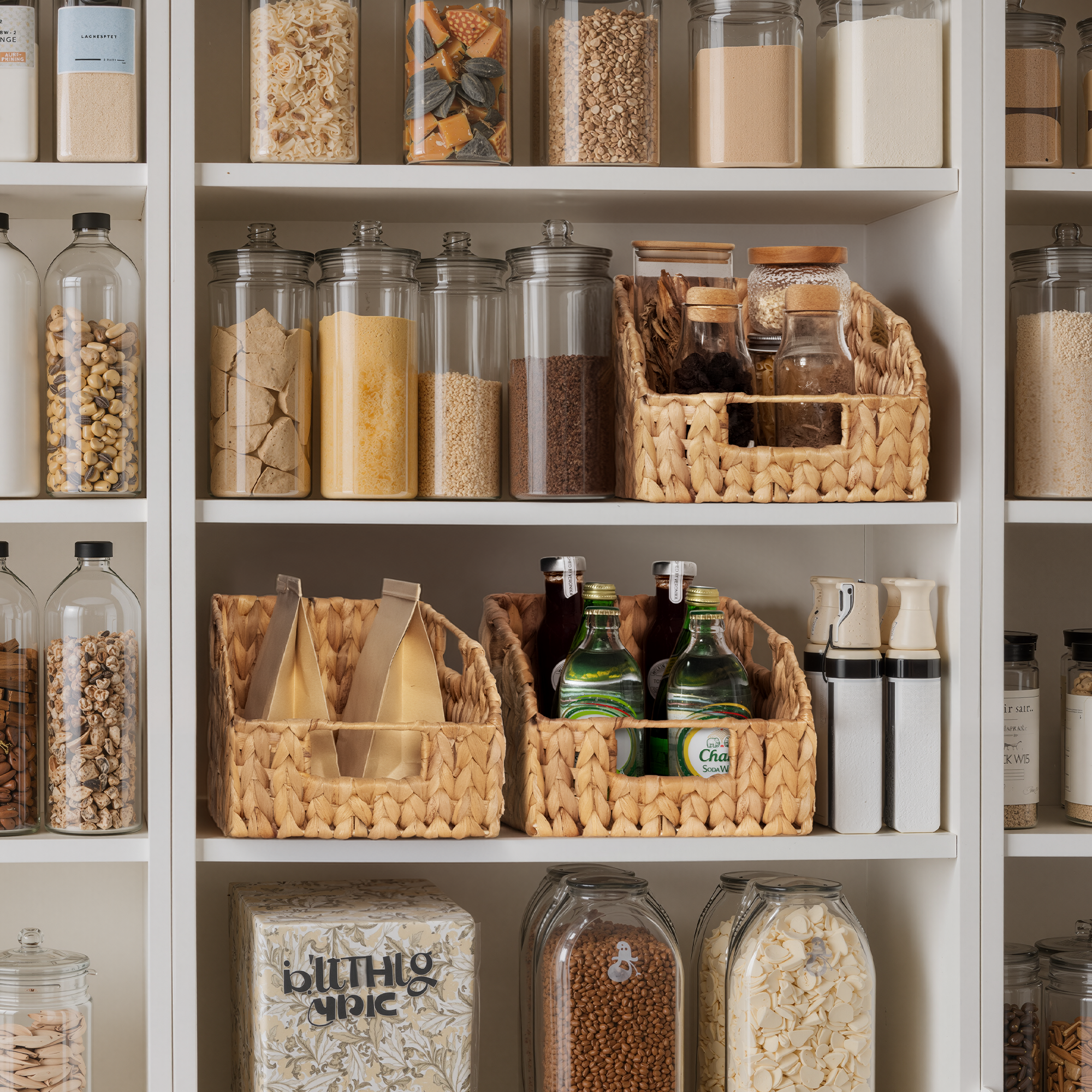Versatile pantry baskets for spices, onions, canned foods, pet food in the kitchen, or magazines, iPads, Kindles, games, and media.