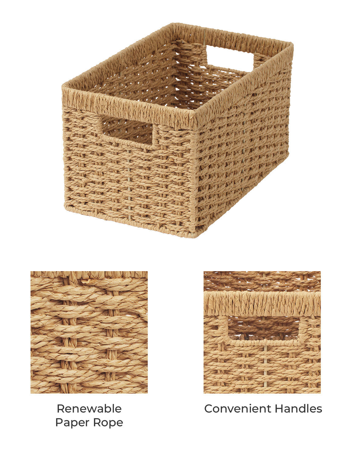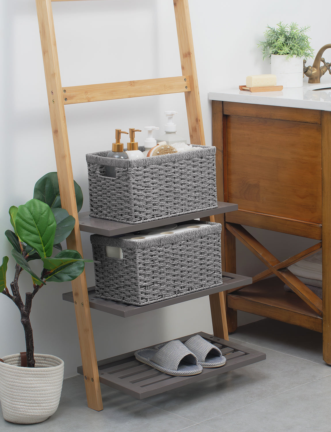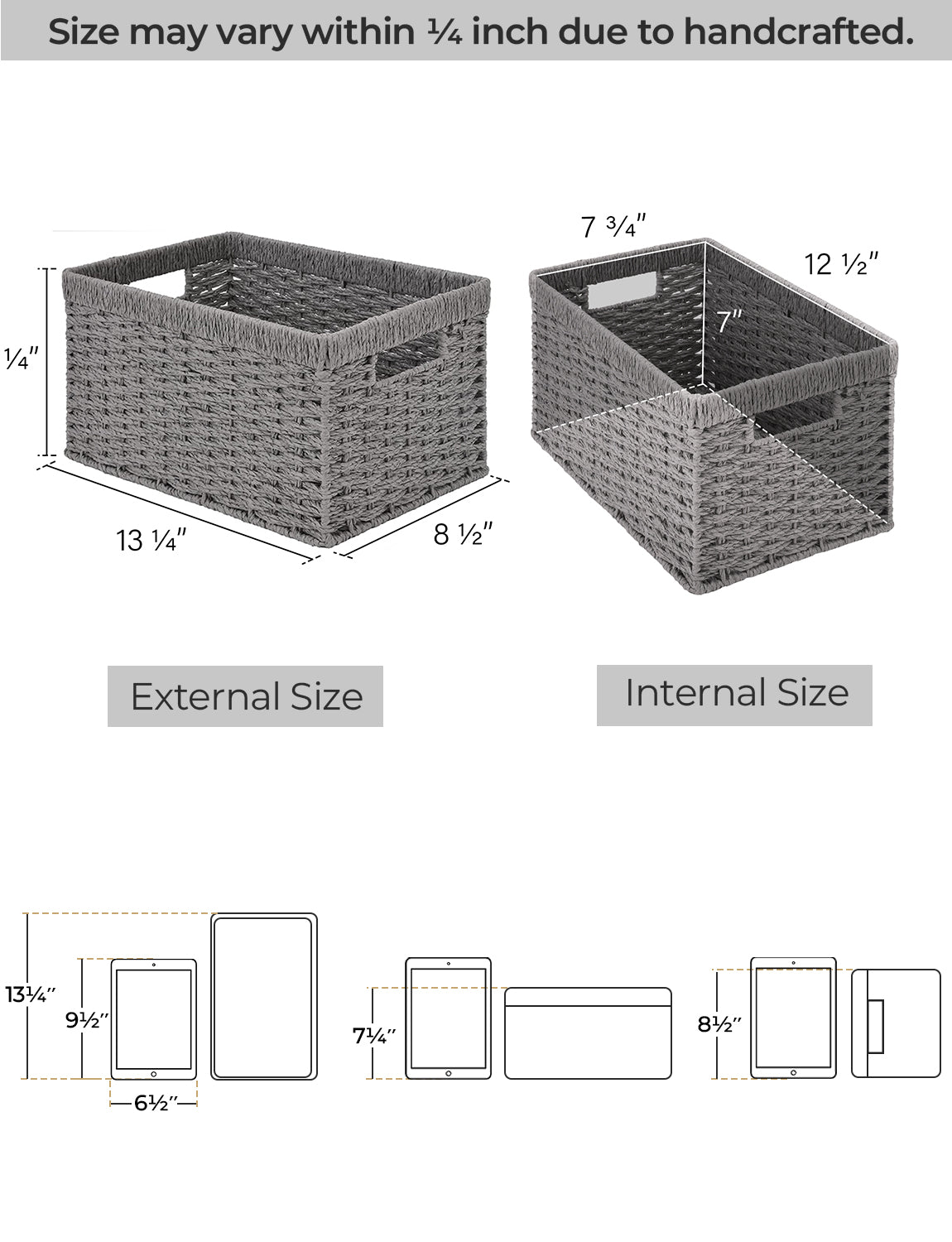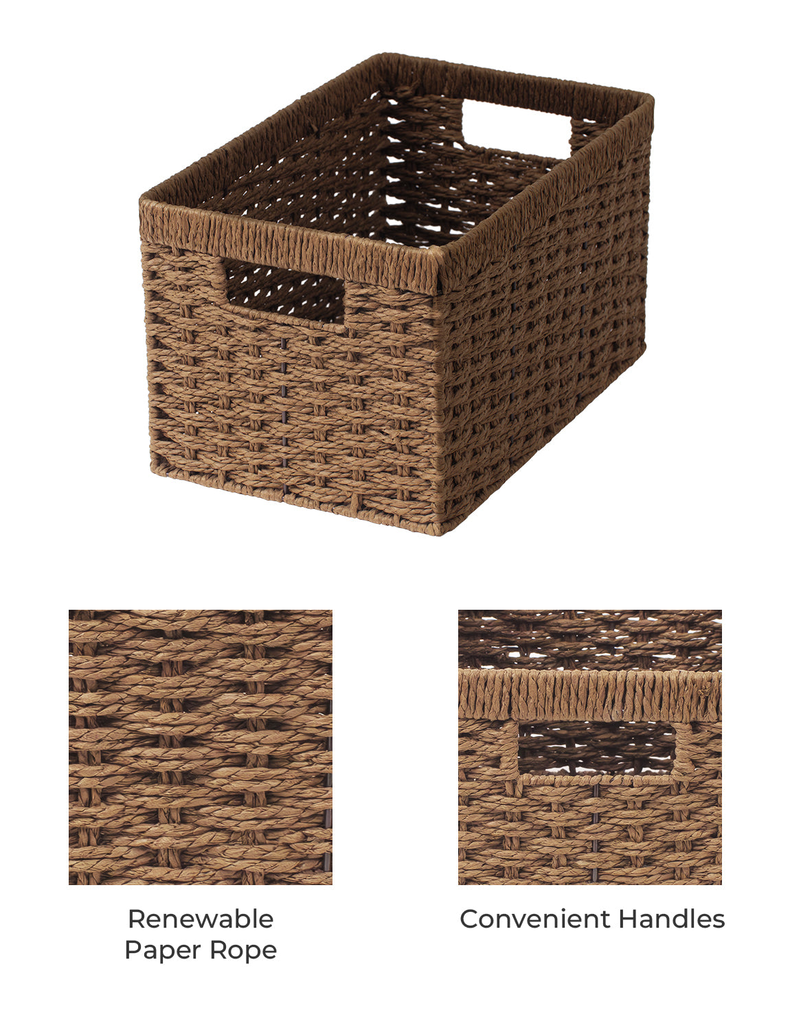 Versatile woven baskets for storing hand towels, toiletries in the bath, or magazines, games, pet toys, media, and household items.