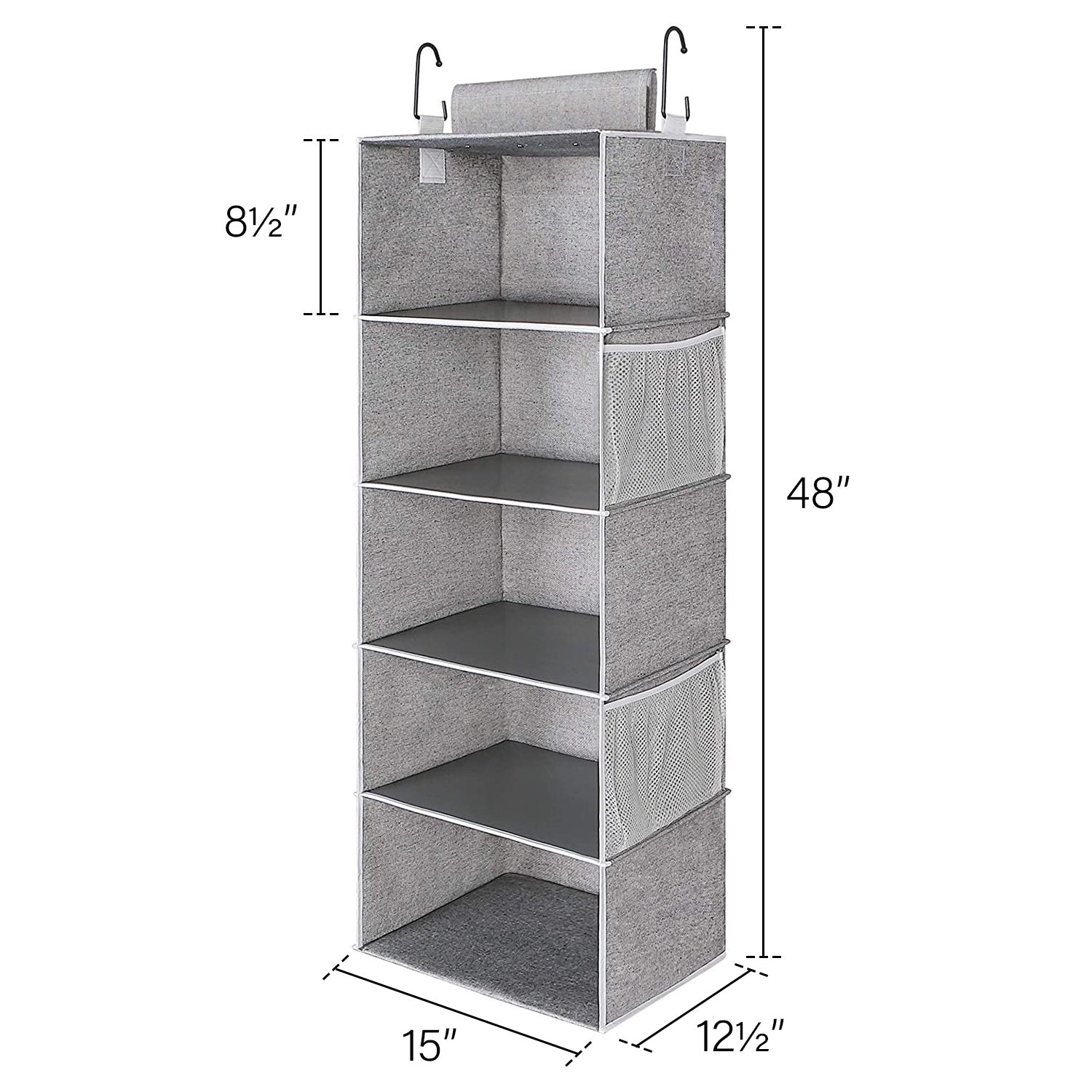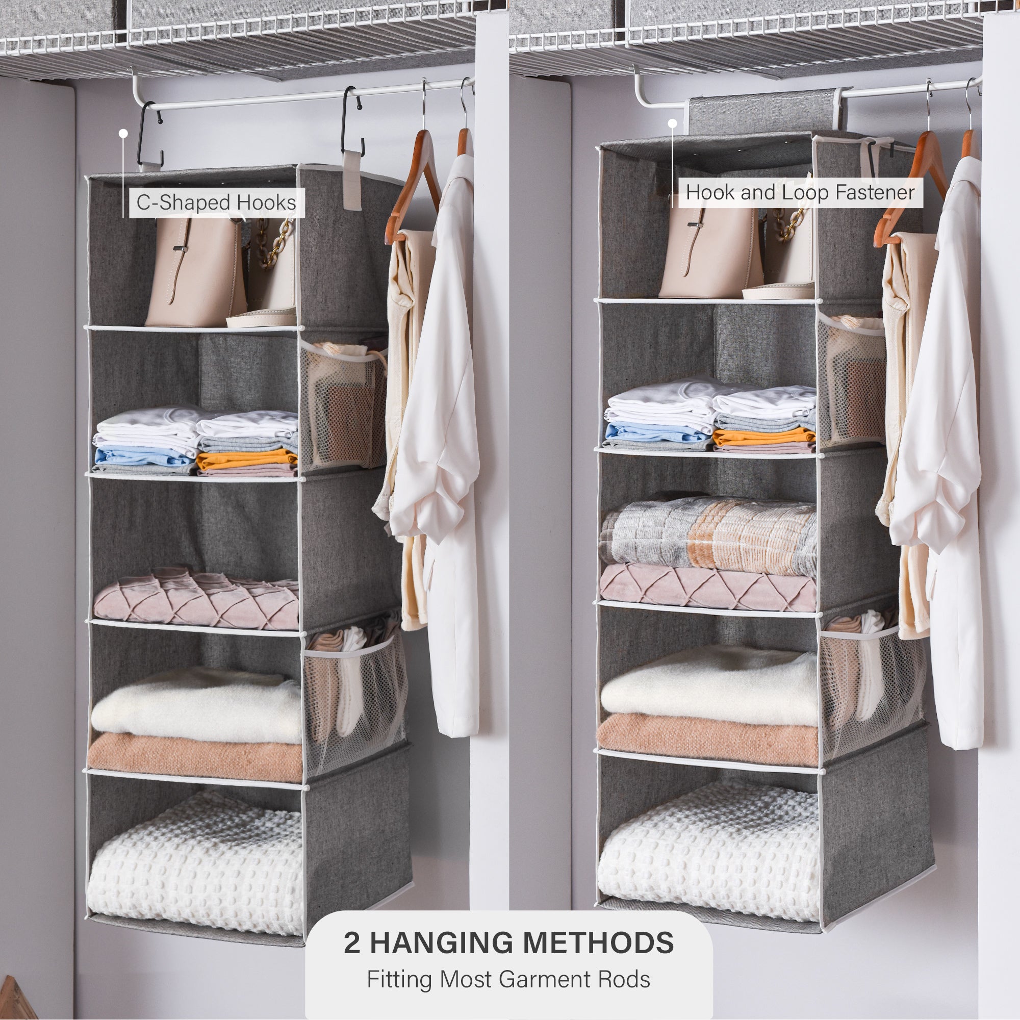 - Wide closet organizer with 2 heavy-duty hooks that fit most closet rods.