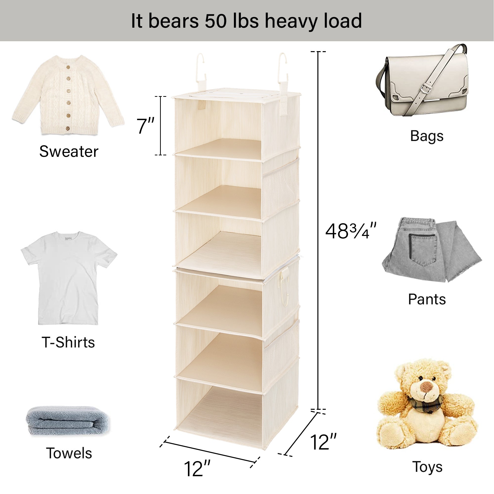Made of canvas cotton fabric, reinforced with heavy-duty plastic board, the closet organizer can hold a weight of up to 50 lbs without bending the top.
