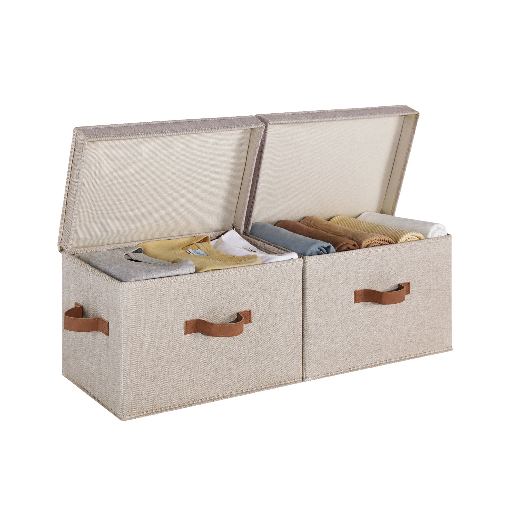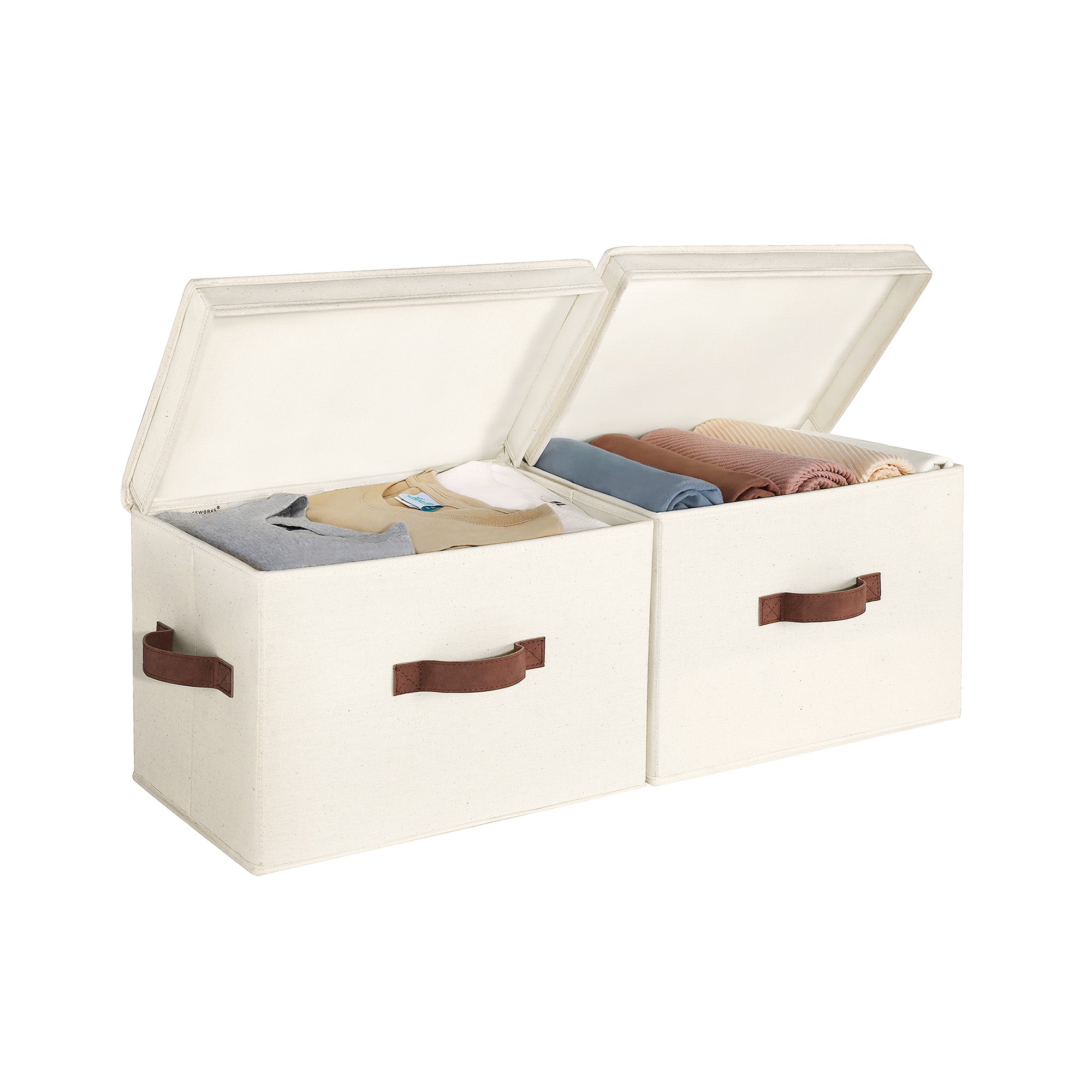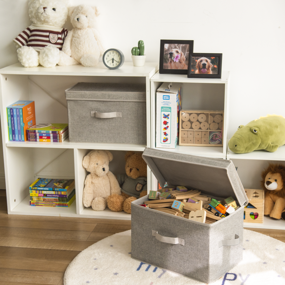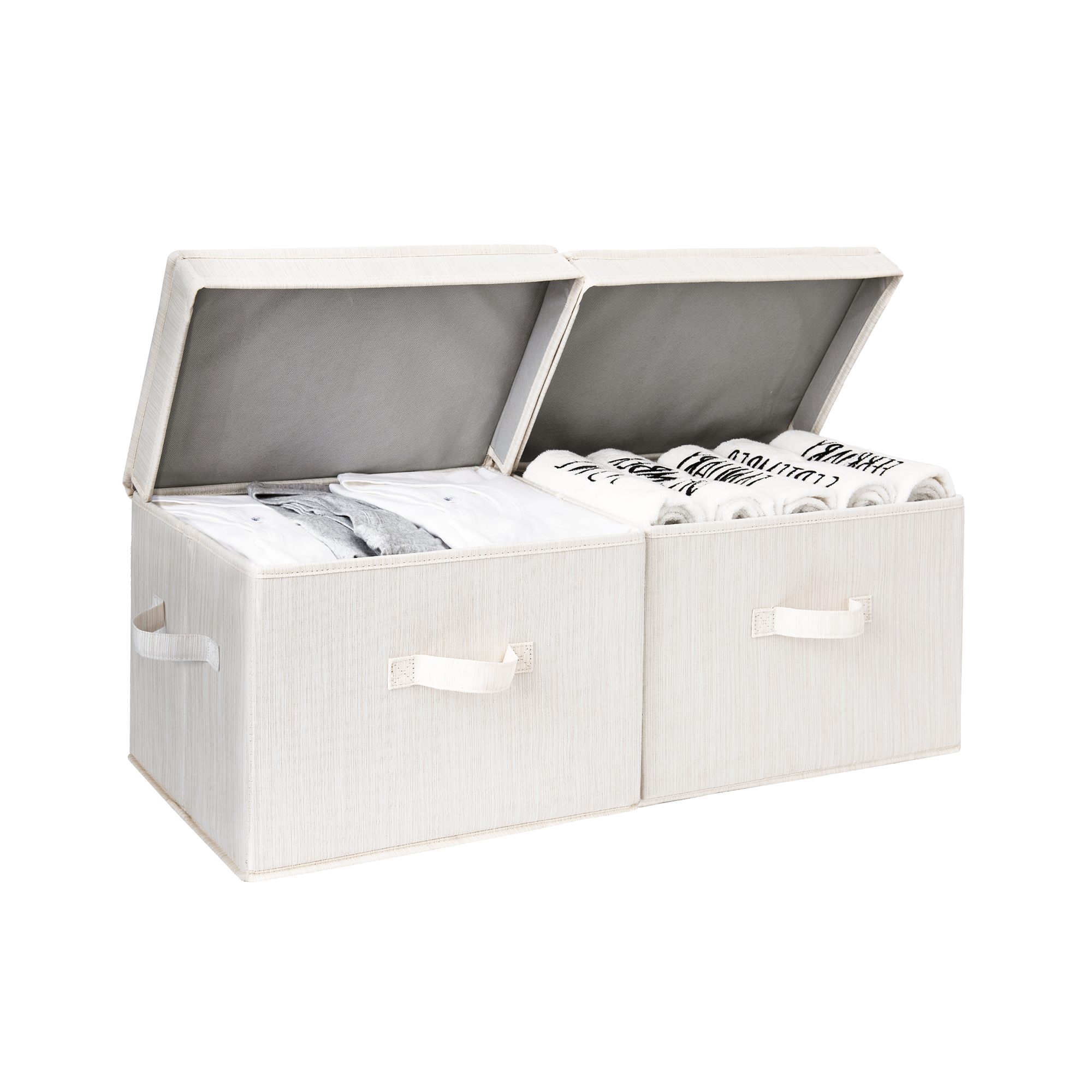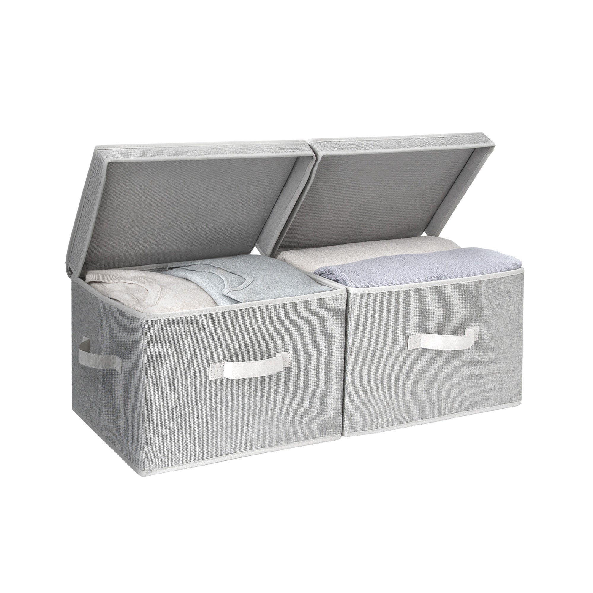 Dust-proof storage bins feature flip-top lids and 3 soft, sewn-in handles on the front and both sides.