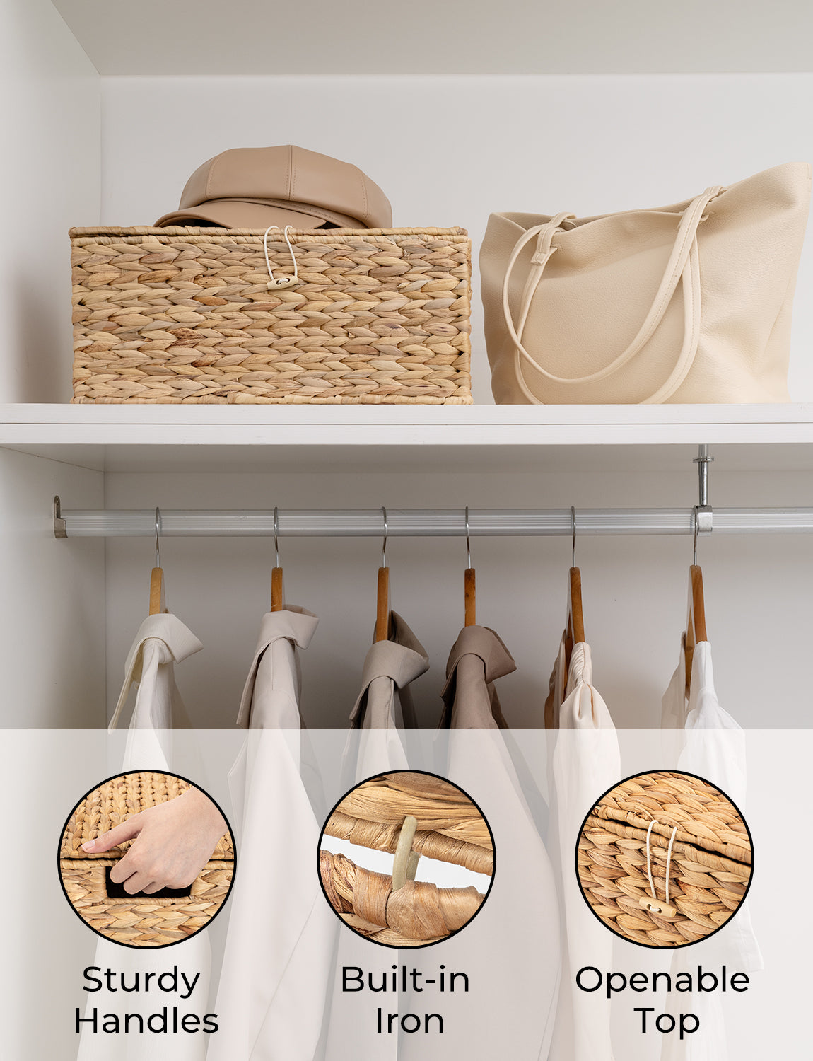 Versatile decorative storage basket for storing hand towels, toiletries in bath, magazines, games, media, and household items. The wicker storage basket features 2 thickened built-in handles for easy carrying and easy pull-out from a top shelf.