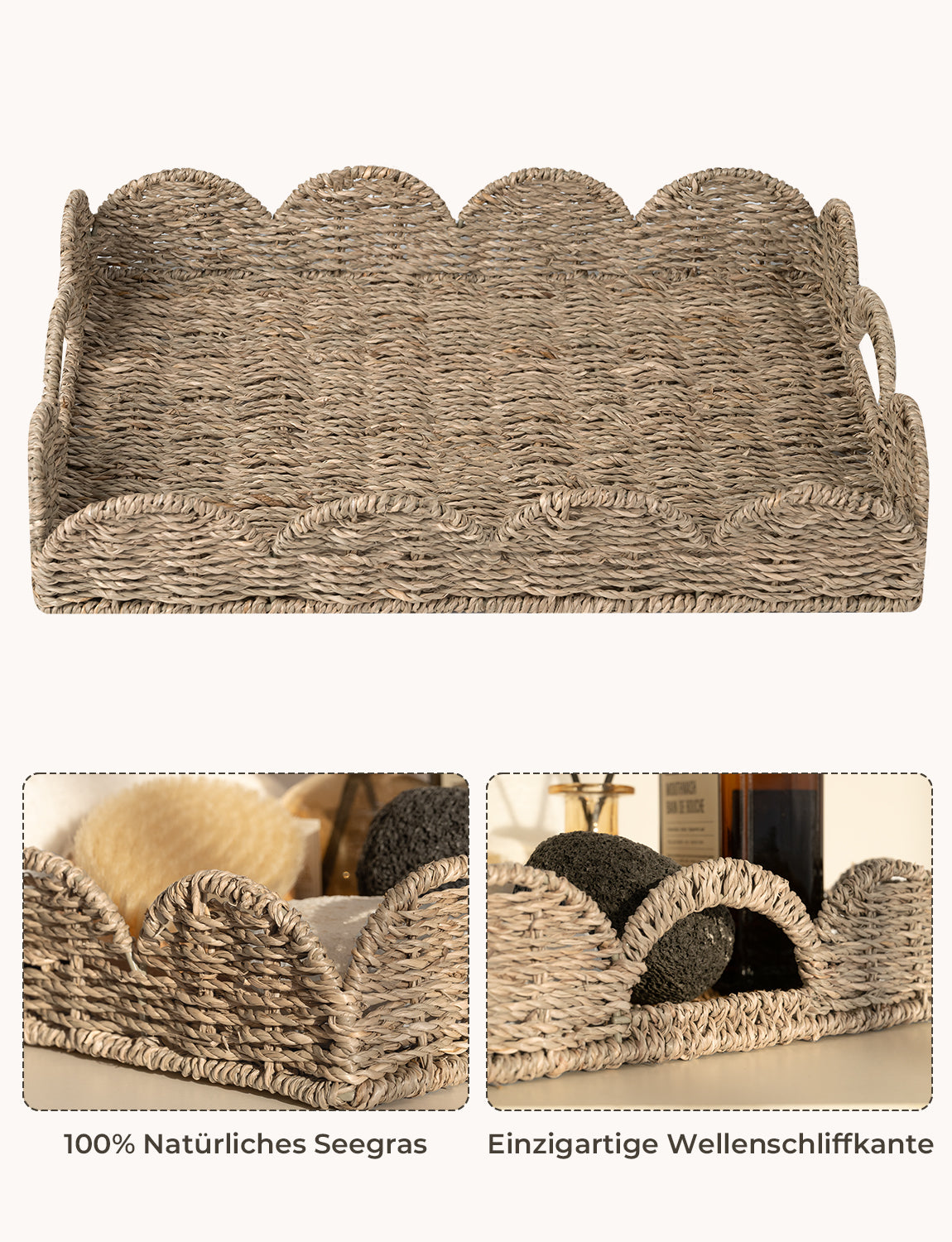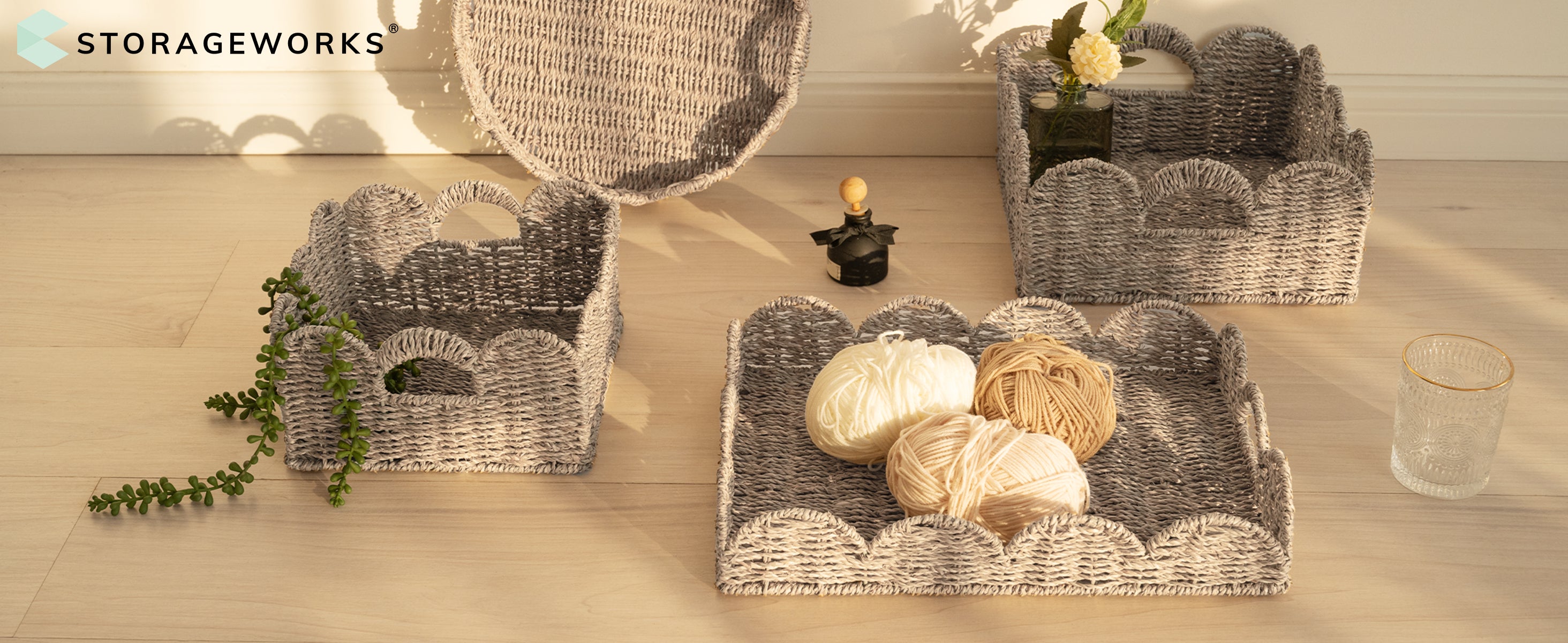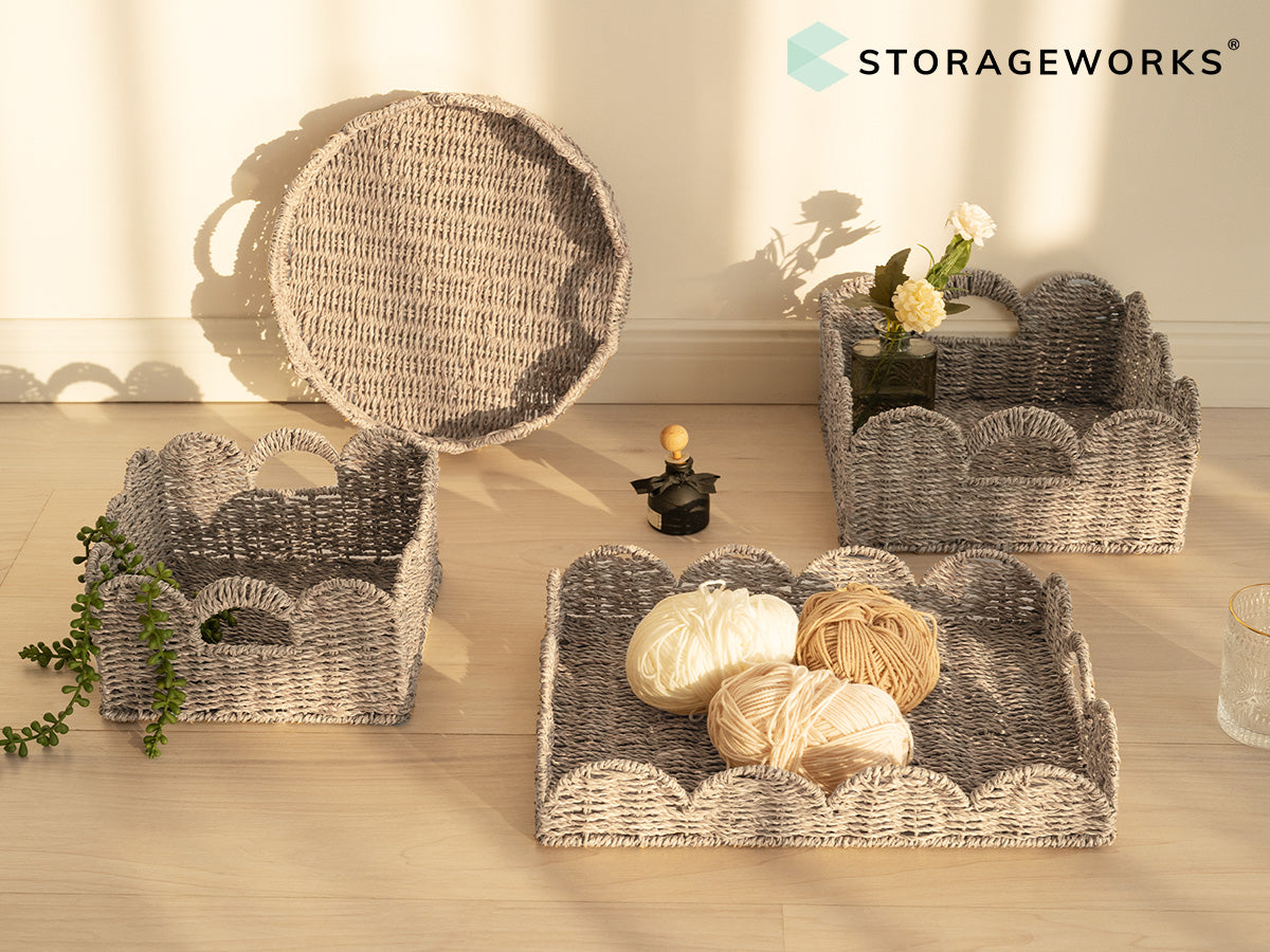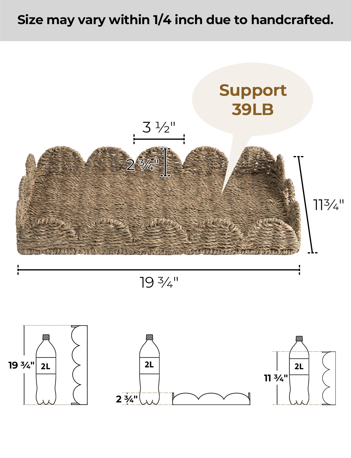 Natural Material: Handcrafted from natural material woven over a sturdy iron frame, this scalloped tray combines traditional craftsmanship with modern design for a durable and renewable storage solution.