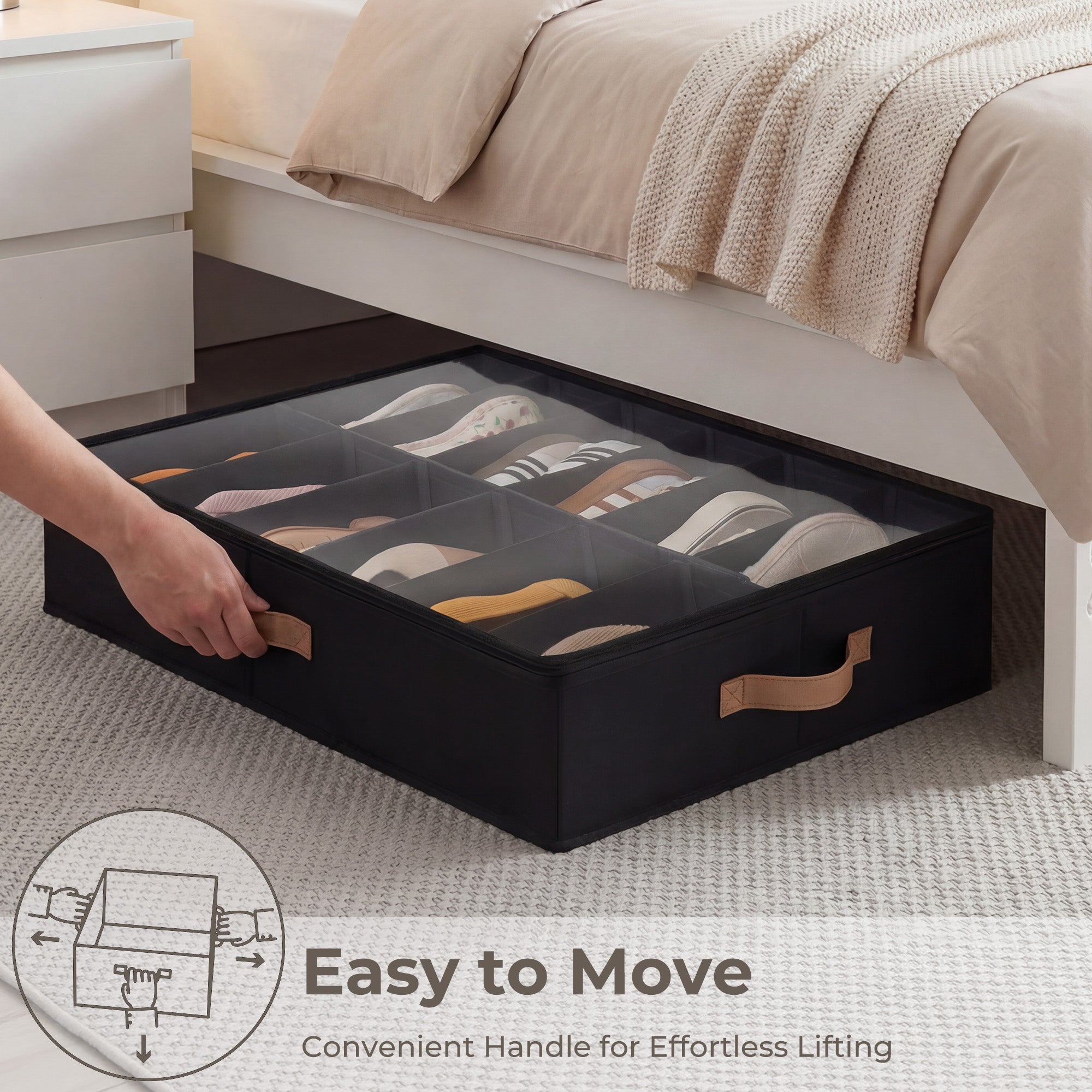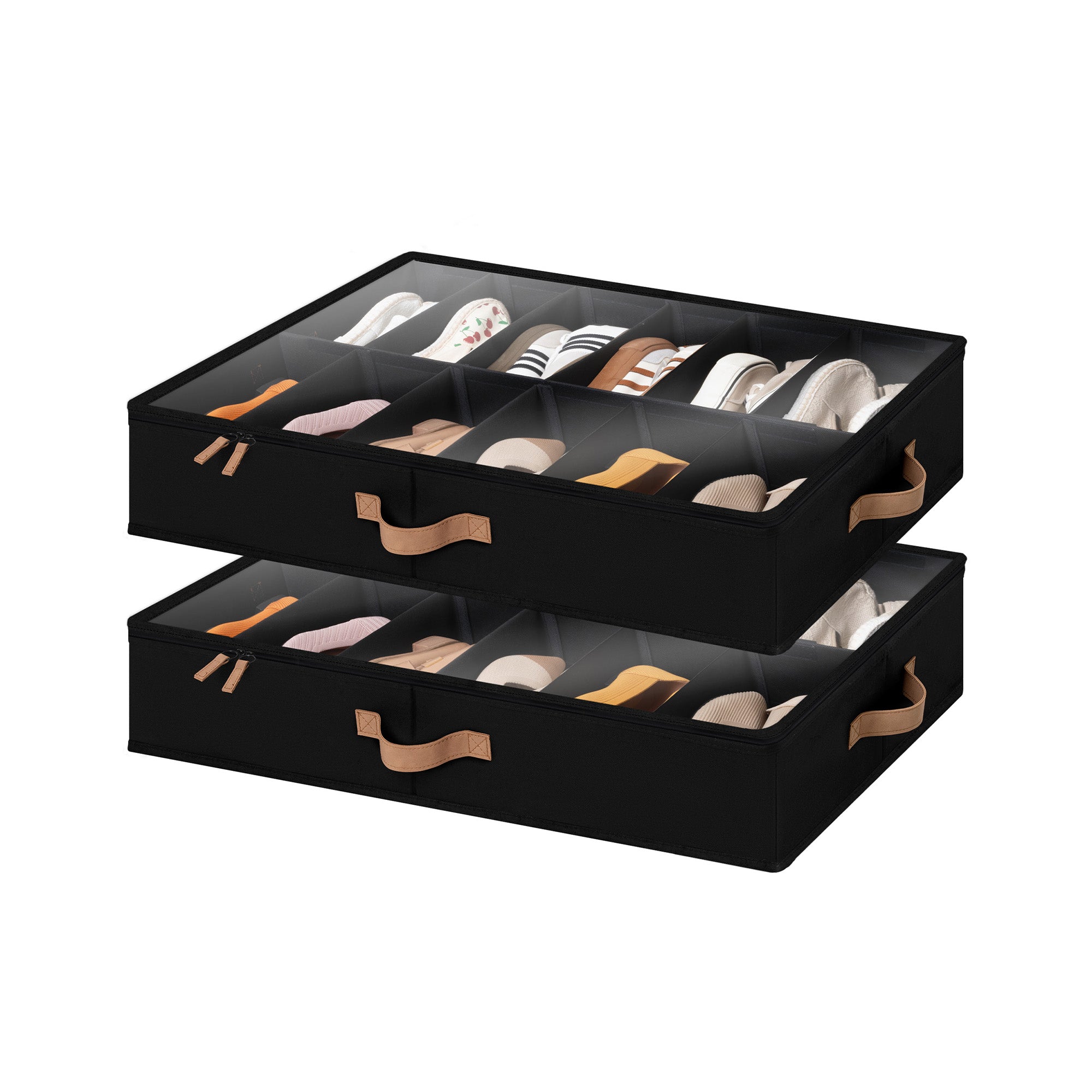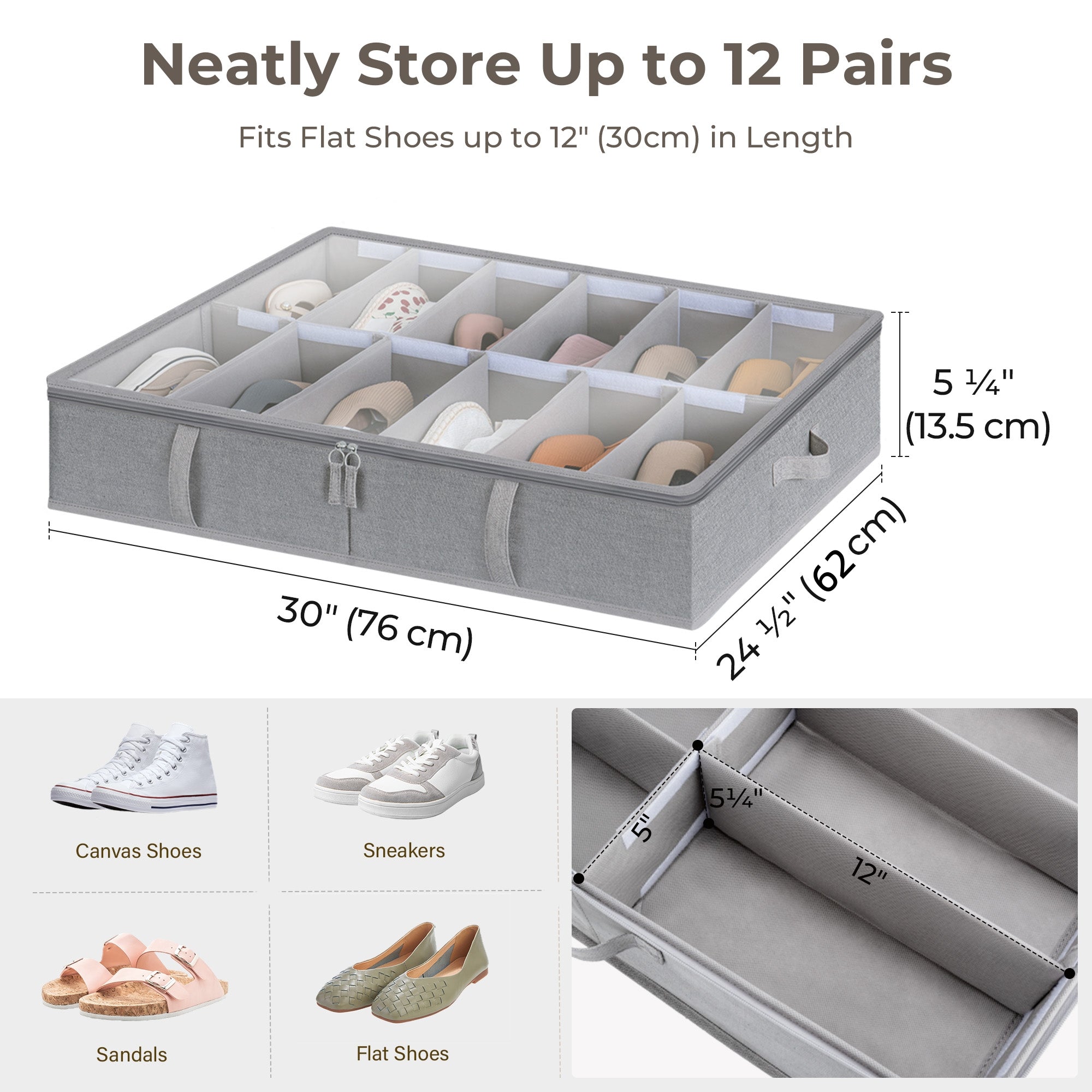 Measuring 30" L x 24 ½" W x 5 ¼" H, these underbed shoe storage organizers can hold up to 24 pairs of shoes with ease (12 each) and are perfect for storing various kinds of shoes such as sneakers, loafers, sandals, and flat shoes.
