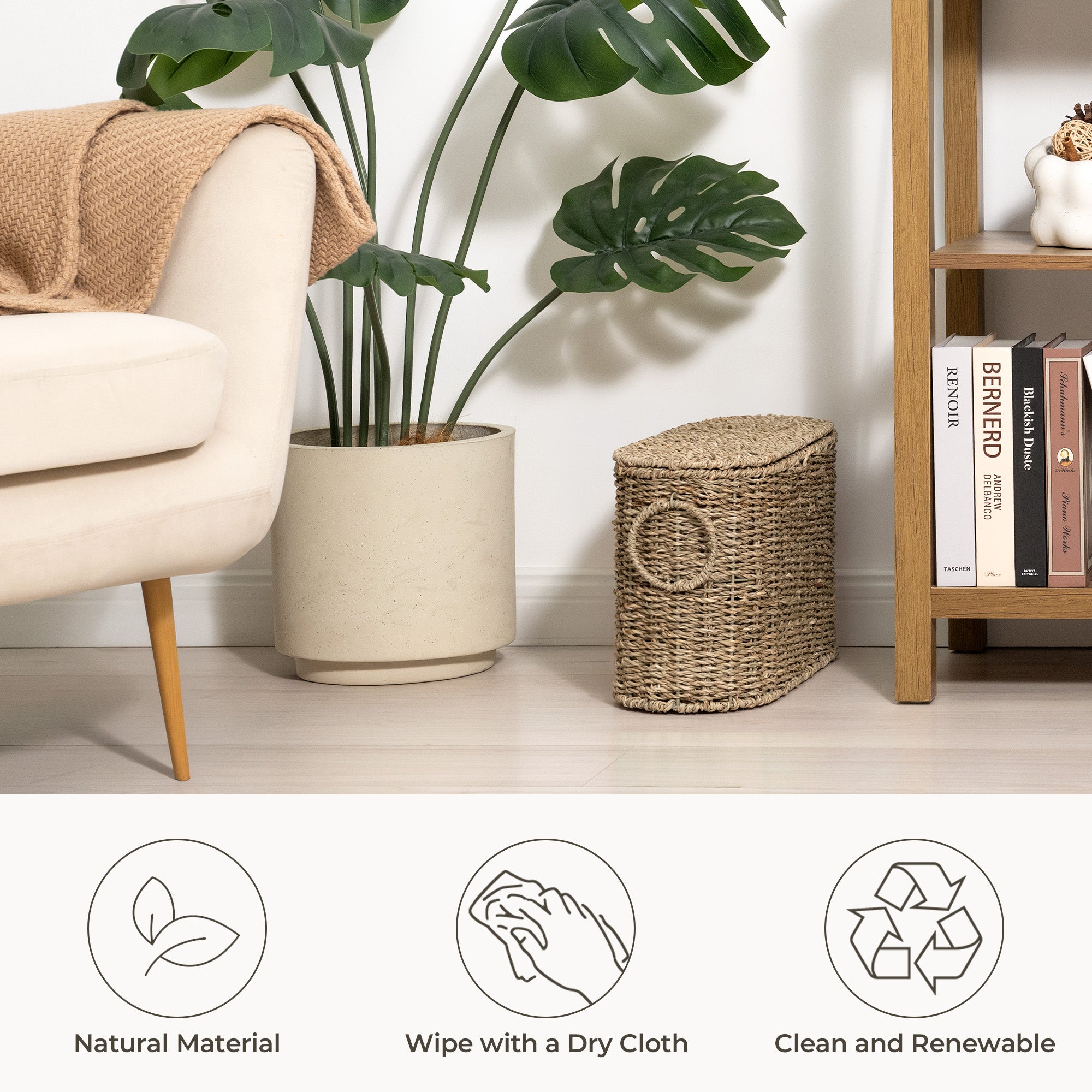 Natural & Secure Storage: Our toilet paper storage basket, handcrafted from natural material by artisans, features intricate woven textures and elevates your space with organic sophistication.