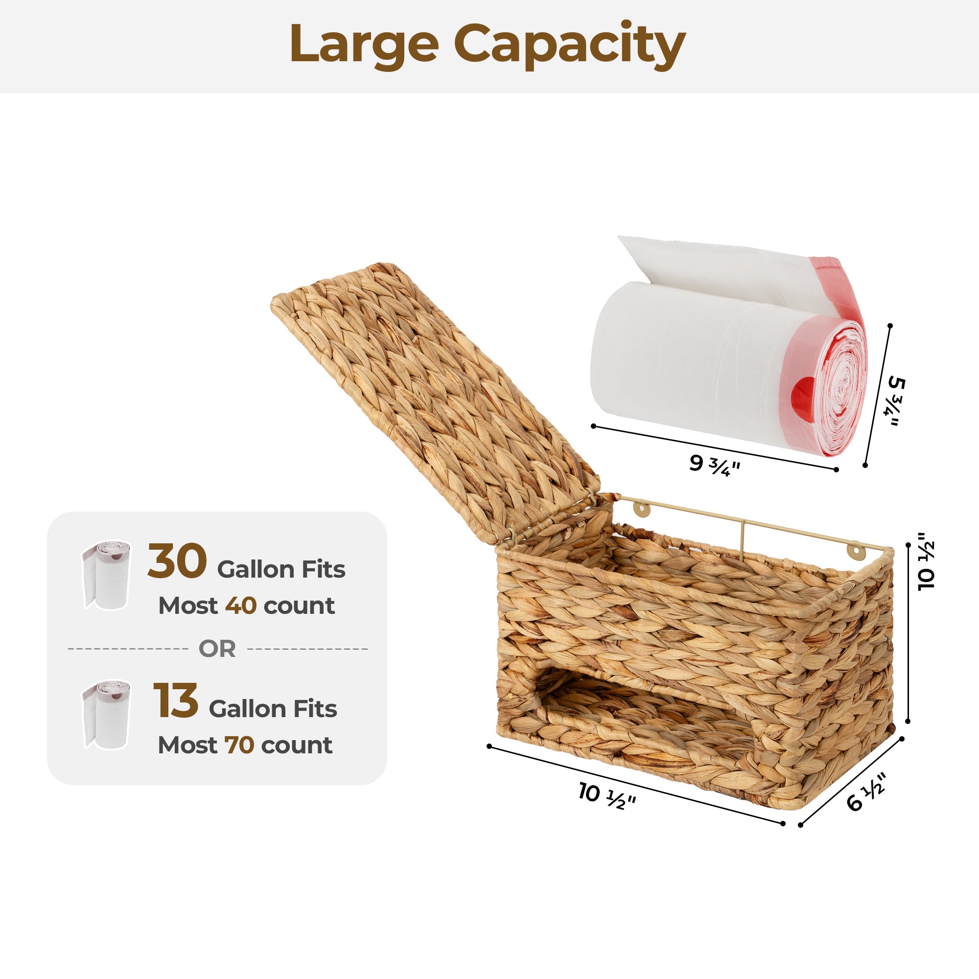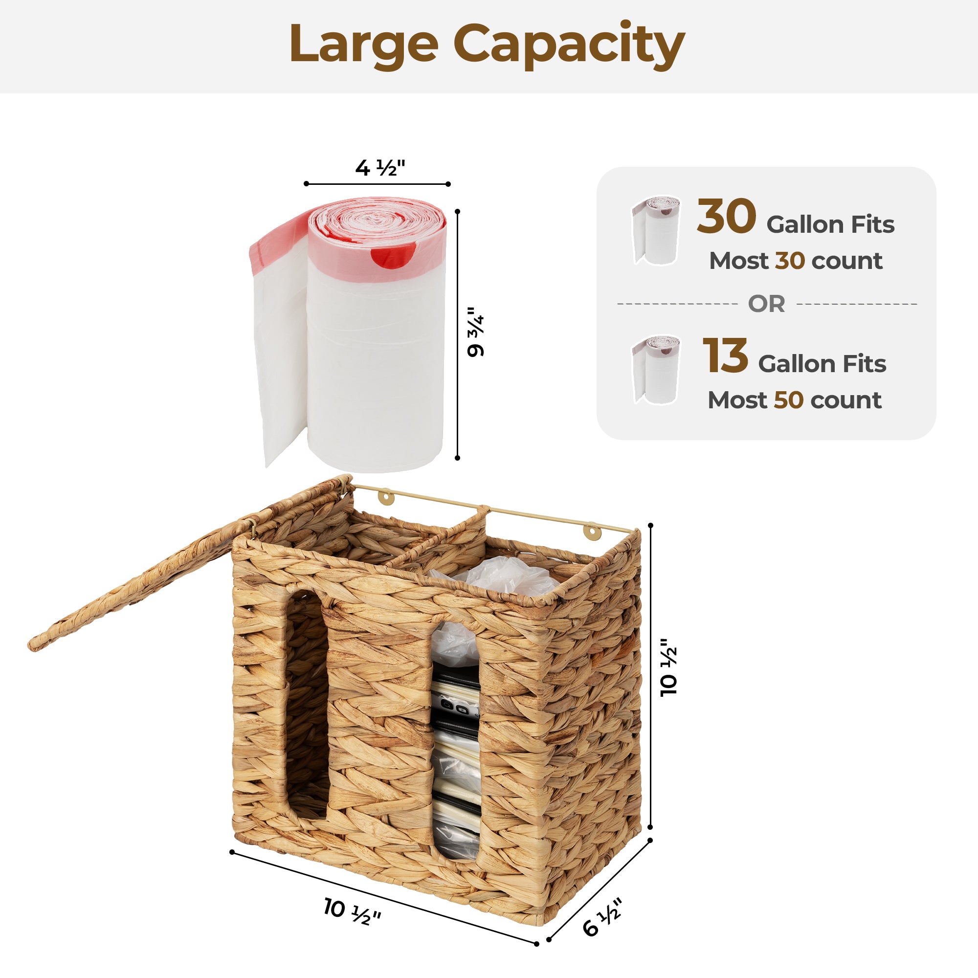 Large Capacity & Compatibility: The trash bag holder dispenser fits 13- and 30-gallon trash bags, compatible with most brands, keeping your home organized.