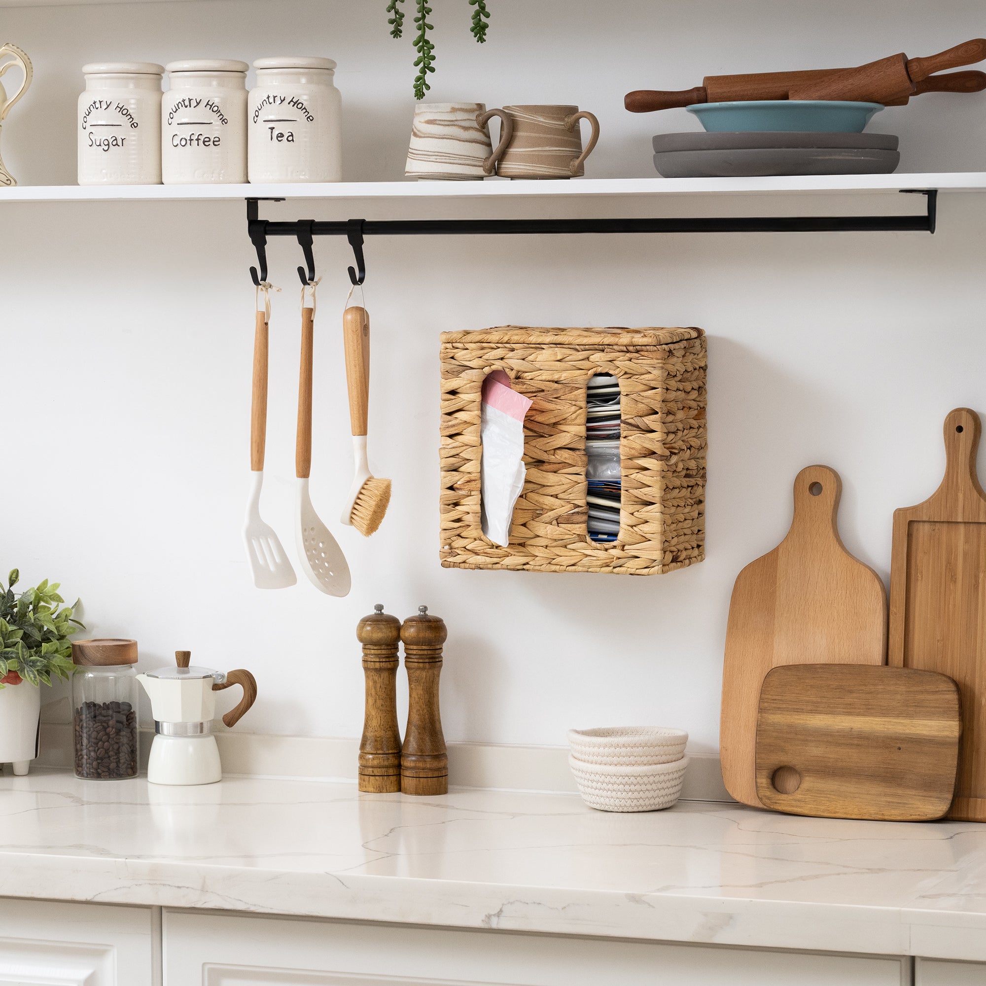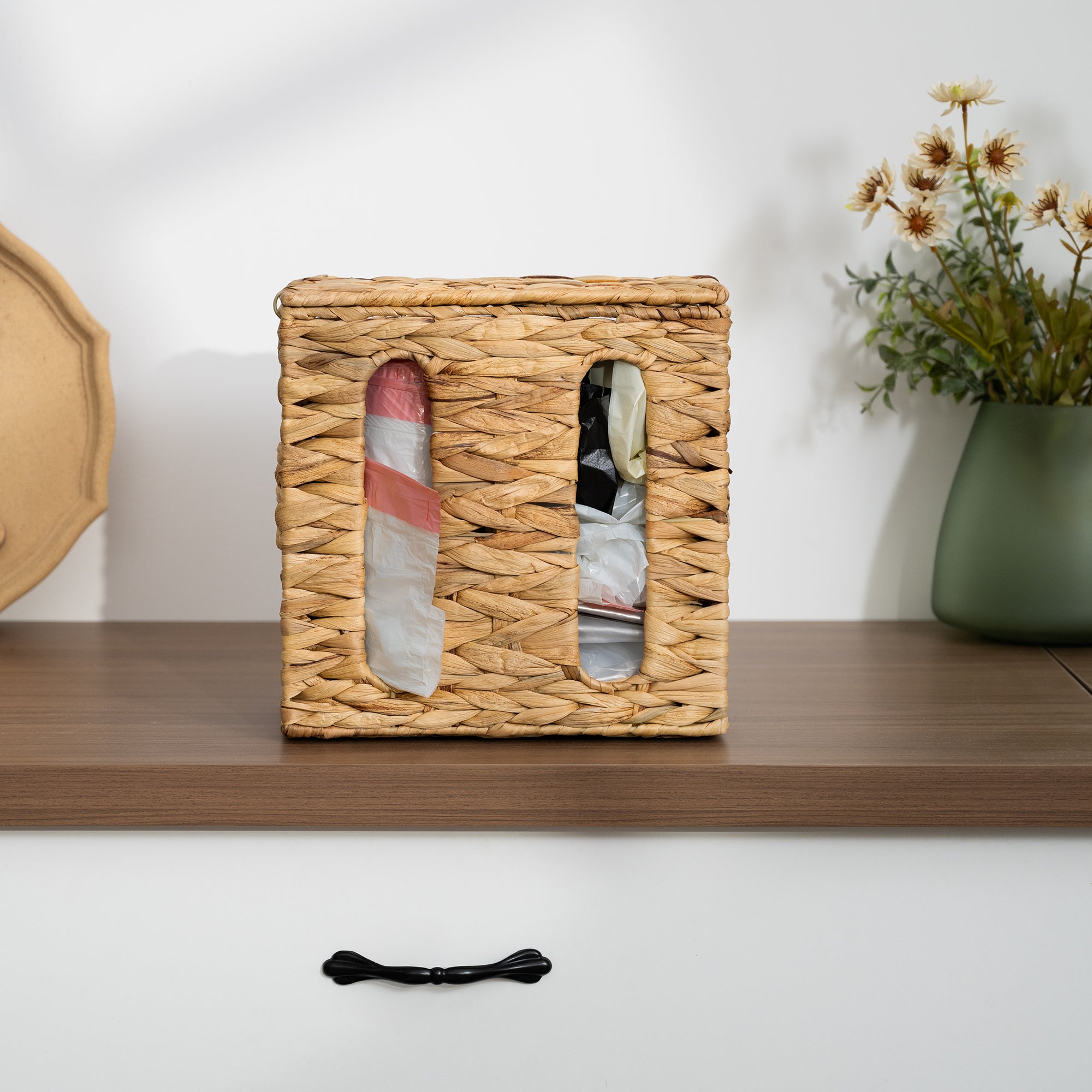Elevate Your Space: The sleek trash bag dispenser stores full bags, blending perfectly with your walls. Modern curves meet hidden functionality for a clean, stylish look.