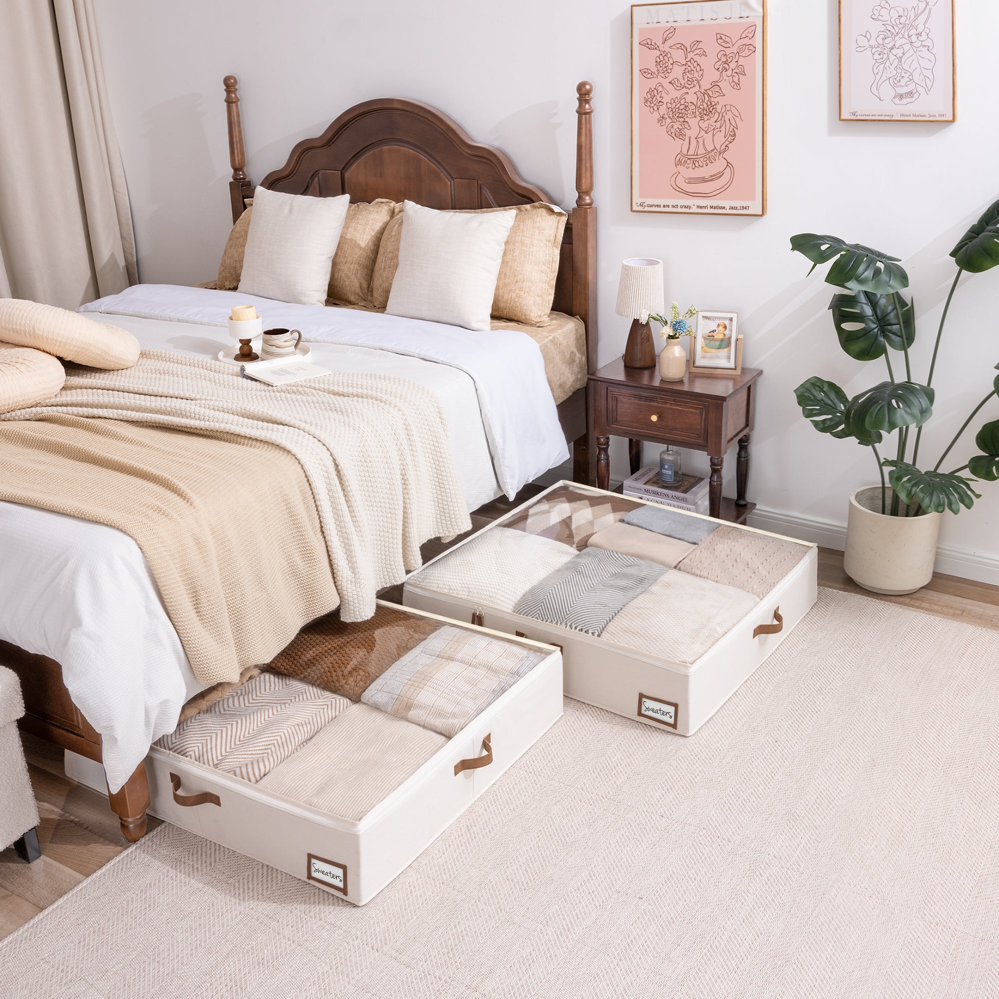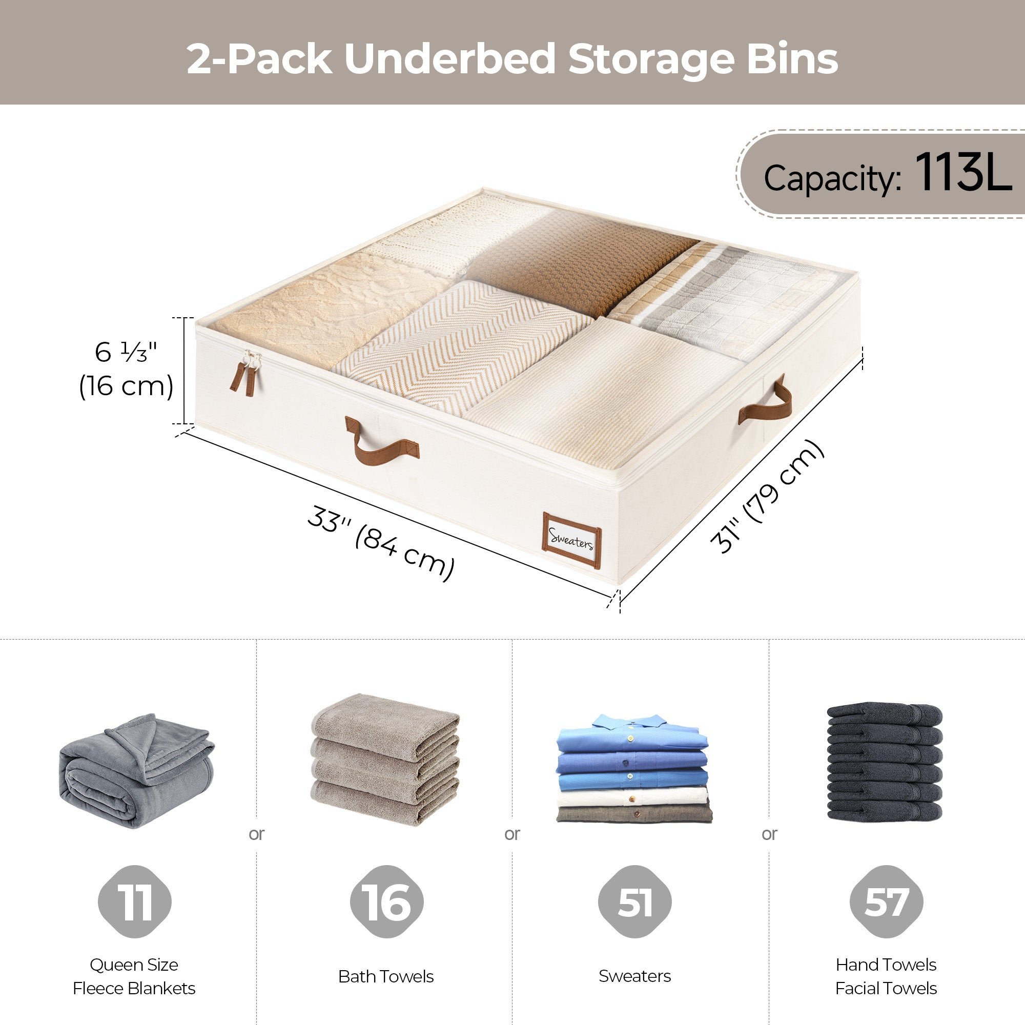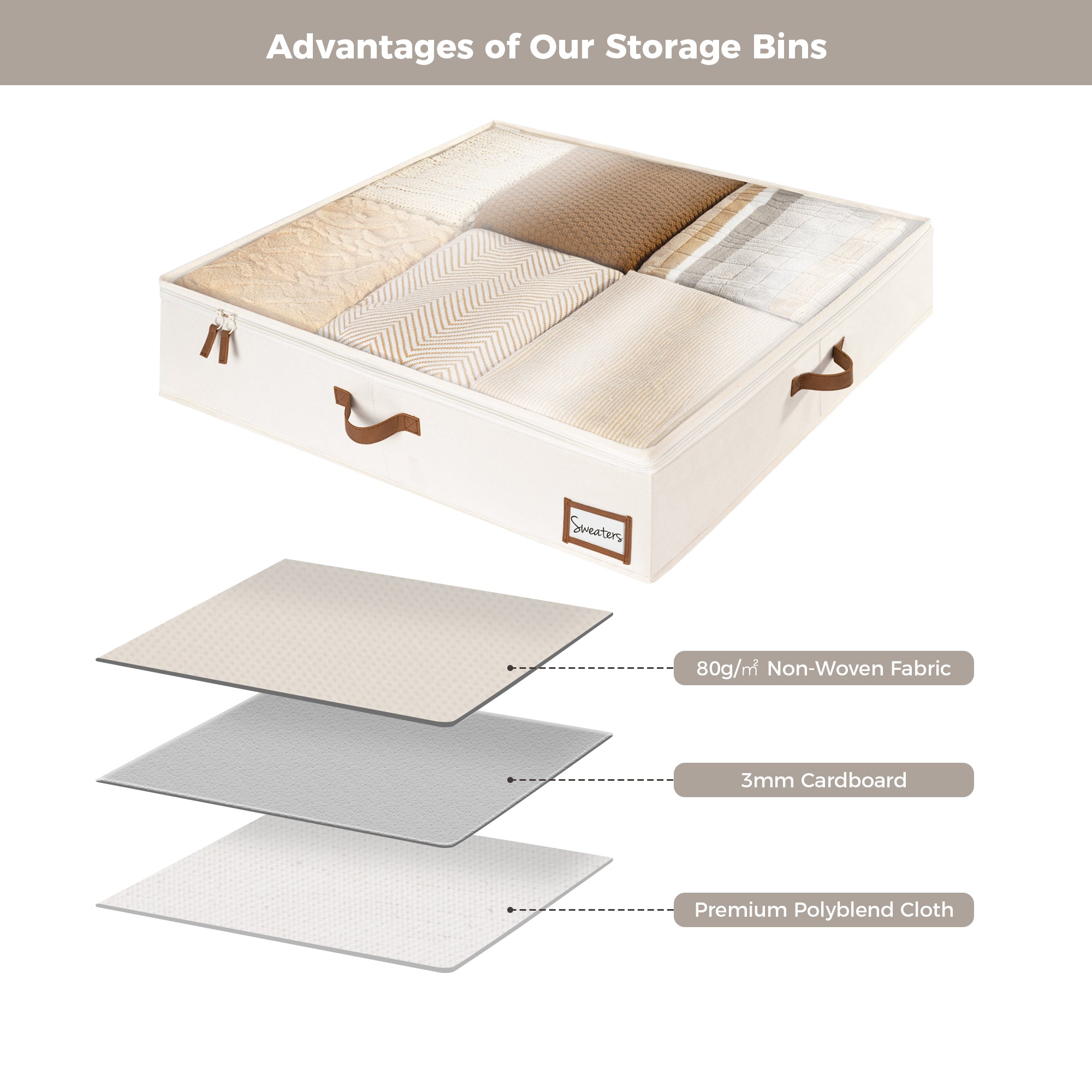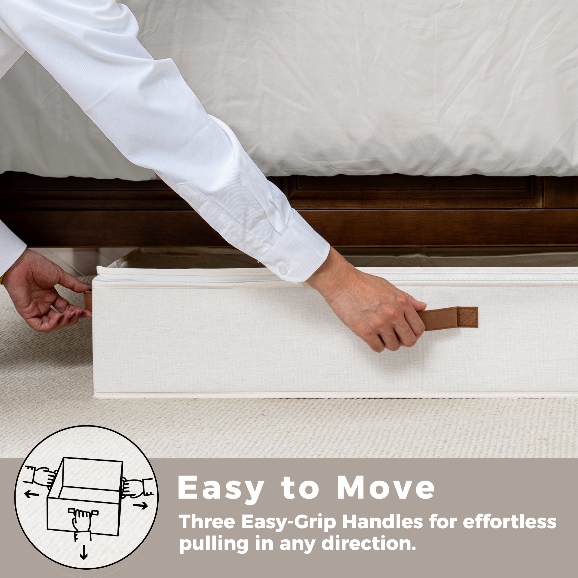 Underbed storage box featuring thick PU handles on 3 sides for easy accessing, carrying, and retrieving.